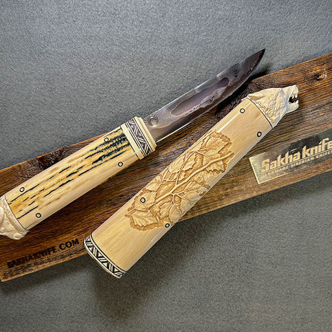 As time went by traditional Sakha knife underwent certain changes. Instead of bloomery iron modern craftsmen use various steel alloys, powder steels, Damascus and Bulat steels. The materials for the handle range from mammoth tusk to horns and bones. One can say that Sakha knife is switching from a utilitarian role to a status symbol. Modern Sakha knives are decorated with precious stones and metals, becoming works of arts.